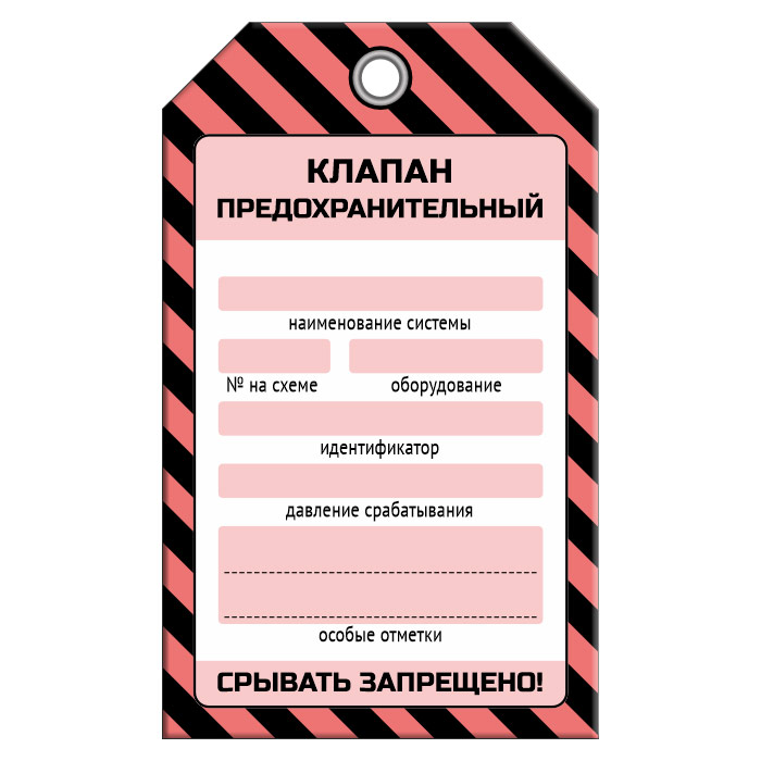 Бирка «КЛАПАН ПРЕДОХРАНИТЕЛЬНЫЙ» размером 70х115 мм имеет полноцветную односторонюю печать. Для дополнительной защиты от факторов окружающей среды возможно ламинирование поверхности
