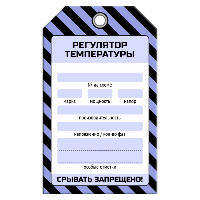 Бирка «РЕГУЛЯТОР ТЕМПЕРАТУРЫ» размером 70х115 мм имеет полноцветную односторонюю печать. Для дополнительной защиты от факторов окружающей среды возможно ламинирование поверхности