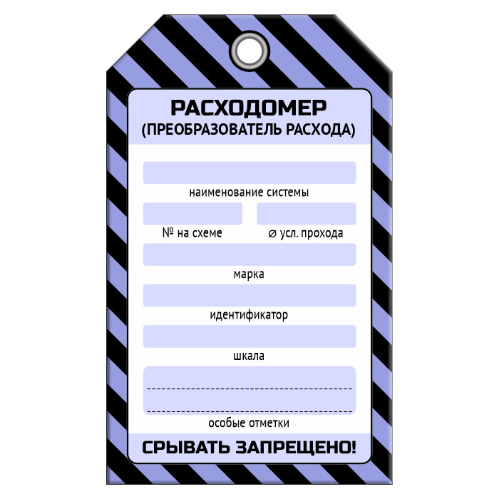 Бирка «РАСХОДОМЕР» размером 70х115 мм имеет полноцветную односторонюю печать. Для дополнительной защиты от факторов окружающей среды возможно ламинирование поверхности