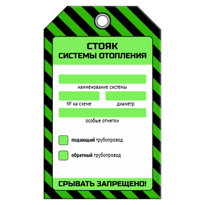 Бирка «СТОЯК СИСТЕМЫ ОТОПЛЕНИЯ» размером 70х115 мм имеет полноцветную односторонюю печать. Для дополнительной защиты от факторов окружающей среды возможно ламинирование поверхности