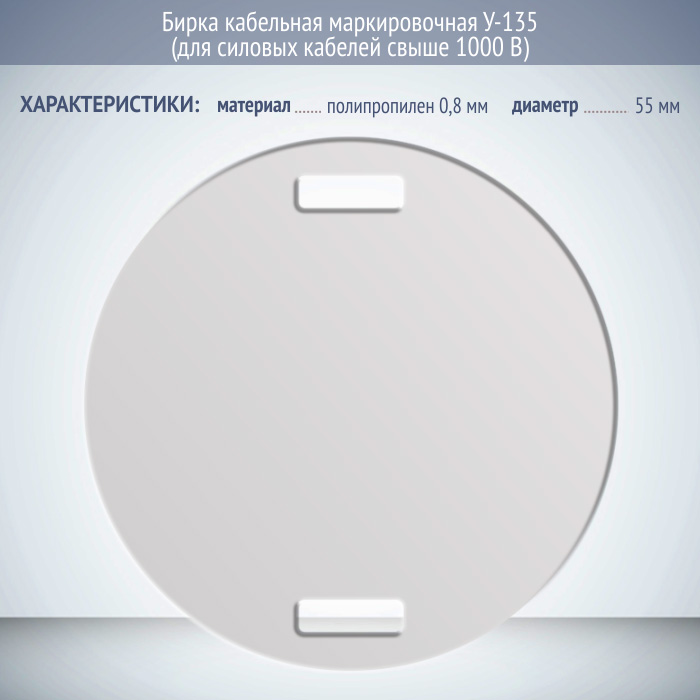 Бирка кабельная маркировочная У-135 (для силовых кабелей свыше 1000 В) изготовлена из полипропилена толщиной 0,8 мм