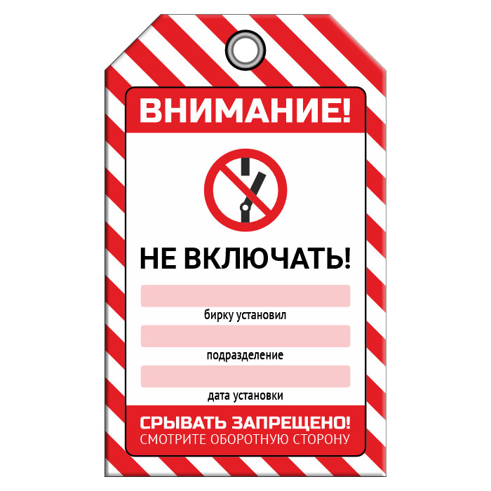 Бирка «НЕ ВКЛЮЧАТЬ!» размером 70х115 мм имеет полноцветную двустороннюю печать. Для дополнительной защиты от факторов окружающей среды возможно ламинирование поверхности