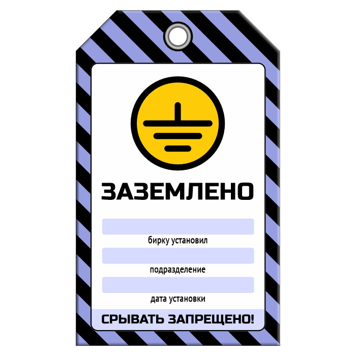 Бирка «ЗАЗЕМЛЕНО» размером 70х115 мм имеет полноцветную одностороннюю печать. Для дополнительной защиты от факторов окружающей среды возможно ламинирование поверхности