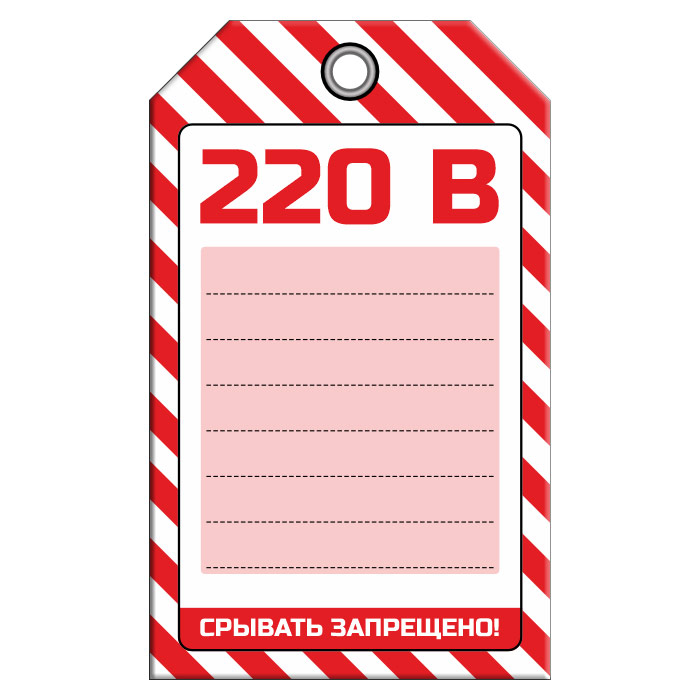 Бирка «НАПРЯЖЕНИЕ 220 В» размером 70х115 мм имеет полноцветную одностороннюю печать. Для дополнительной защиты от факторов окружающей среды возможно ламинирование поверхности
