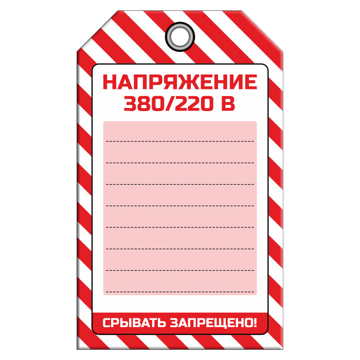 Бирка «НАПРЯЖЕНИЕ 380/220 В» размером 70х115 мм имеет полноцветную одностороннюю печать. Для дополнительной защиты от факторов окружающей среды возможно ламинирование поверхности