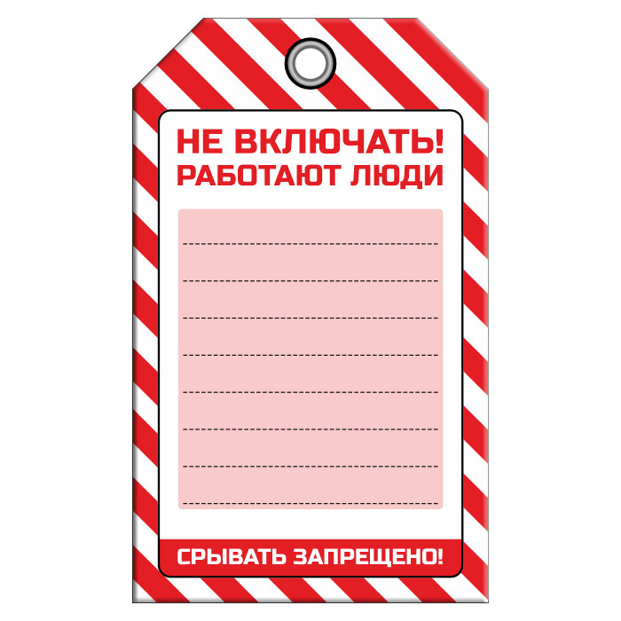Бирка «НЕ ВКЛЮЧАТЬ! РАБОТАЮТ ЛЮДИ» размером 70х115 мм имеет полноцветную одностороннюю печать. Для дополнительной защиты от факторов окружающей среды возможно ламинирование поверхности