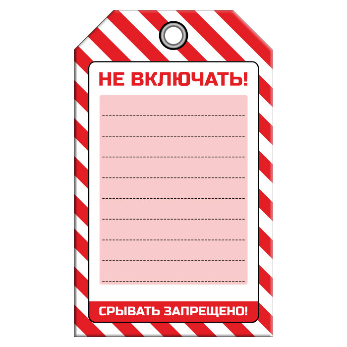 Бирка «НЕ ВКЛЮЧАТЬ!» размером 70х115 мм имеет полноцветную одностороннюю печать. Для дополнительной защиты от факторов окружающей среды возможно ламинирование поверхности