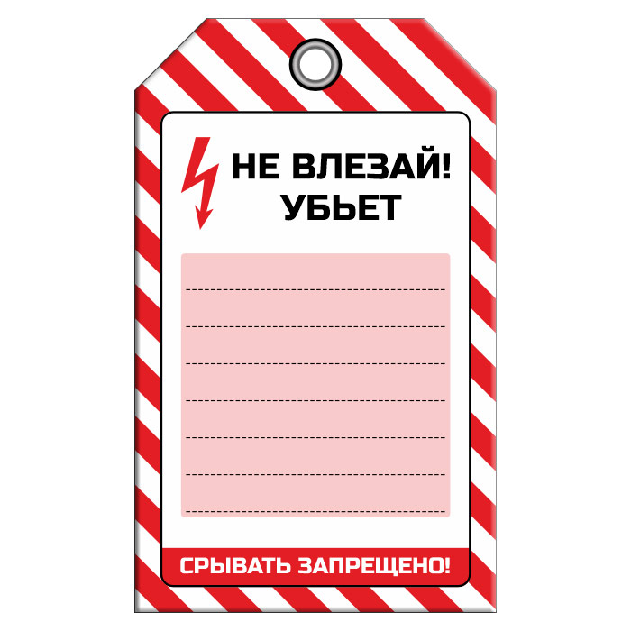 Бирка «НЕ ВЛЕЗАЙ! УБЪЕТ» размером 70х115 мм имеет полноцветную одностороннюю печать. Для дополнительной защиты от факторов окружающей среды возможно ламинирование поверхности