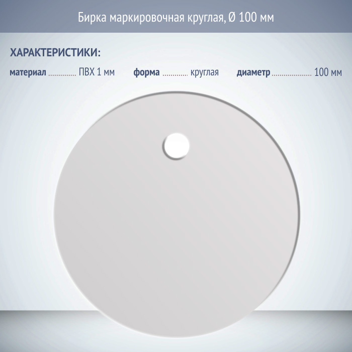 Бирка маркировочная круглая, изготовленная на пластике, толщиной 1 мм, диаметром 100 мм обеспечивает большой объем наносимой информации и легкость крепления – бирки крепятся с помощью вспомогательных элементов типа стяжек или куска проволоки