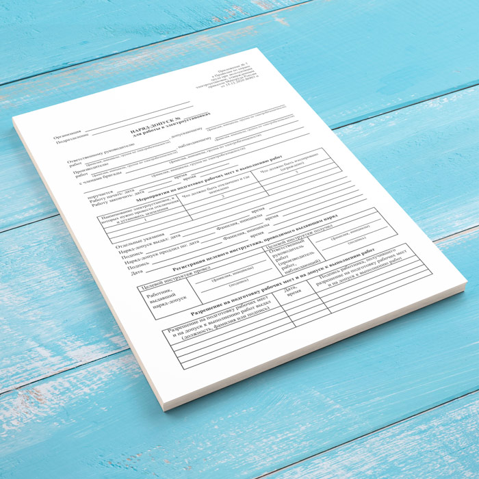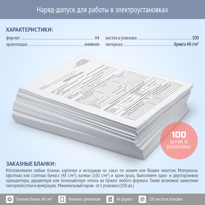 Бланк Наряд-допуск для работы в электроустановках изготавливается на газетной бумаге плотностью 48 г/м2, односторонняя печать А4 формата книжного расположения. В упаковке 100 штук
