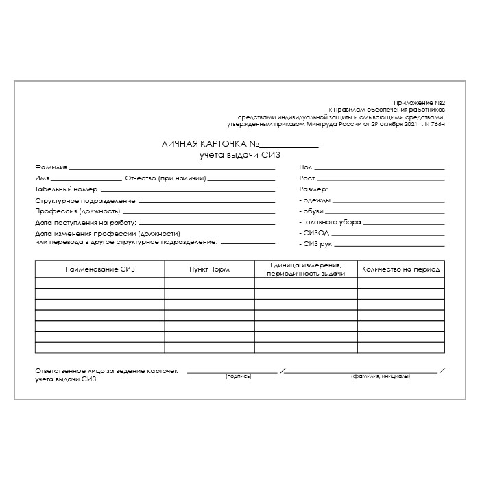 Форма Личной карточки учета выдачи средств индивидуальной защиты соответствует Приложению N 2 к Приказу Минтруда России от 29.10.2021 N 766н "Об утверждении Правил обеспечения работников средствами индивидуальной защиты и смывающими средствами". Выдача работникам и возврат ими СИЗ, выдача дерматологических СИЗ, смывающих средств фиксируются записью в личной карточке учета выдачи СИЗ.