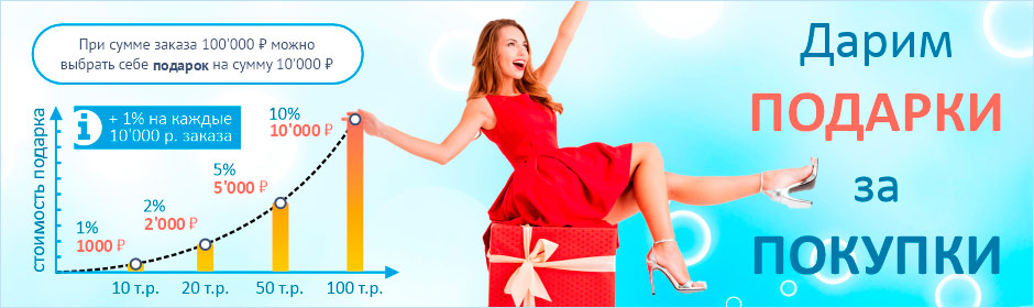 За каждые 10'000 ₽ от стоимости счета вы получаете +1% к общей скидке. Теперь вы можете выбрать себе подарок на сумму скидки. Это значит, что при сумме заказа 100'000 ₽ (10% скидки) вы сможете выбрать себе подарок на сумму 10'000 ₽. Максимальная скидка - 10%. Дополнительные скидки обговариваются. Скидки не суммируются