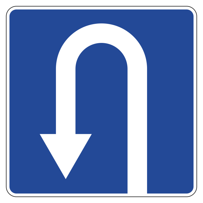 Знак указывает место для разворота. Дорожный знак 6.3.1 устанавливают на дорогах с разделительной полосой перед местом разворота на разделительной полосе, на дорогах без разделительной полосы - над крайней левой полосой движения в данном направлении. Знак допускается устанавливать справа на дорогах с числом полос для движения в данном направлении не более трех. В этом случае применяют предварительный знак с табличкой 8.1.1 на расстоянии 100-150 м до основного знака
