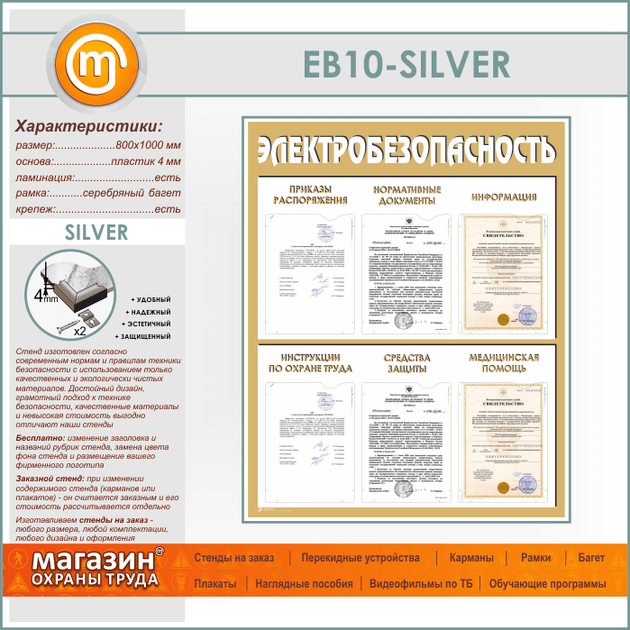 Стенд «Электробезопасность» с 6 карманами (EB-10-SILVER)