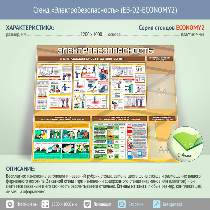 Стенд «Электробезопасность до 1000 вольт» с плоским и объемным карманами (EB-02-ECONOMY2)