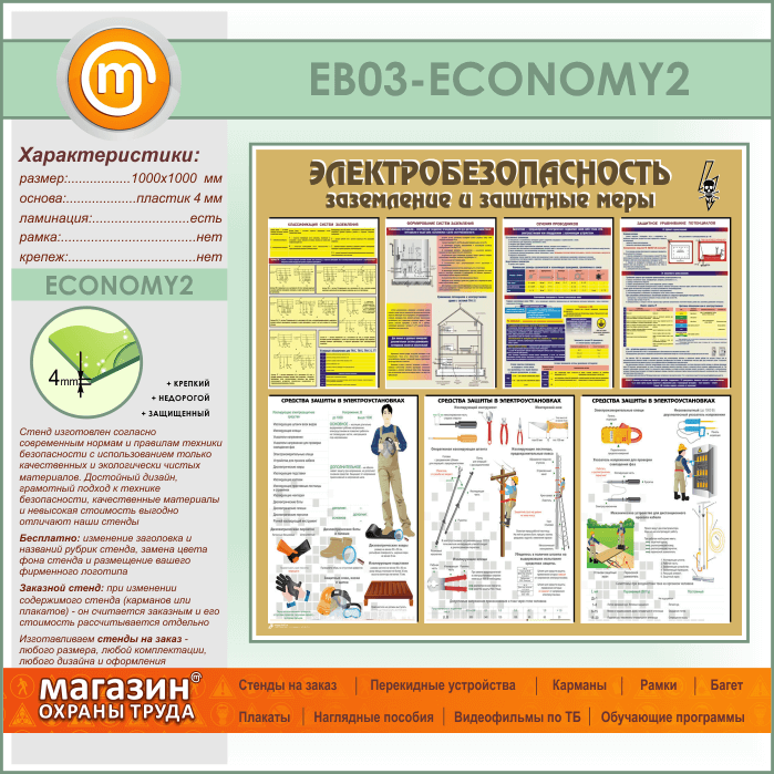 Стенд «Электробезопасность. Заземление и защитные меры» – это стенд с наглядной информацией о классификации систем заземления и формировании систем заземления, сечение проводников и защитное уравнивание потенциалов. Также на стенде размещена информация о средствах защиты в электроустановках – защитные очки и щитки, диэлектрические перчатки и обувь, изолирующие коврики и подставки, оперативные штанги и изолирующие клещи, знаки безопасности и переносные заземления