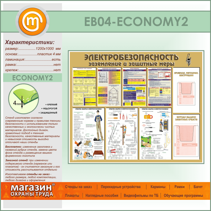 Стенд «Электробезопасность. Заземление и защитные меры» – это стенд с наглядной информацией о классификации систем заземления и формировании систем заземления, сечение проводников и защитное уравнивание потенциалов. Также на стенде размещена информация о средствах защиты в электроустановках – защитные очки и щитки, диэлектрические перчатки и обувь, изолирующие коврики и подставки, оперативные штанги и изолирующие клещи, знаки безопасности и переносные заземления. На стенде установлен объемный карман А5 формата для размещения брошюры с правилами, методиками или инструкциями по электробезопасности, а под ним – объемный карман А4 формата для размещения журнала выдачи защитных средств