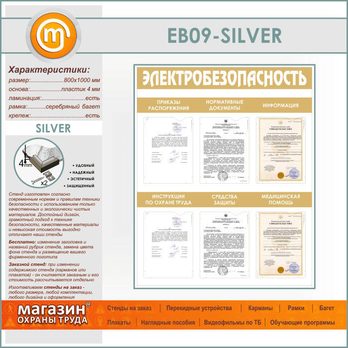 Стенд «Электробезопасность» с 6 карманами (EB-09-SILVER)
