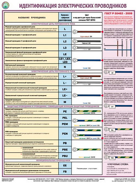 Плакат «Идентификация электрических проводников» с образцами маркировки электрических проводов – название, классификация и цветовое обозначение