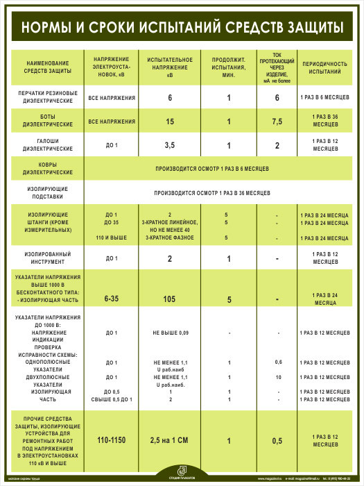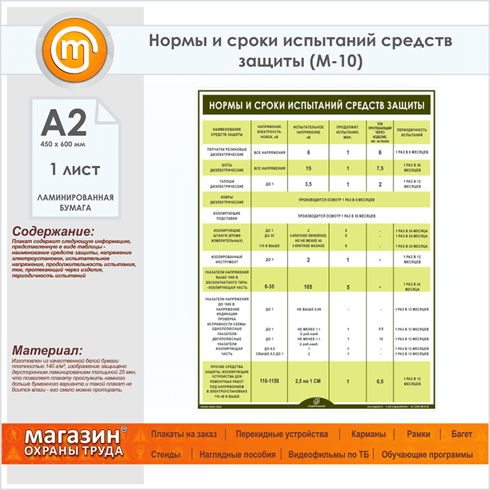 Плакат «Нормы и сроки испытаний средств защиты» (М-10, ламинированная бумага, А2, 1 лист)