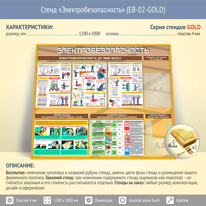Стенд «Электробезопасность до 1000 вольт» с плоским и объемным карманами (EB-02-GOLD)