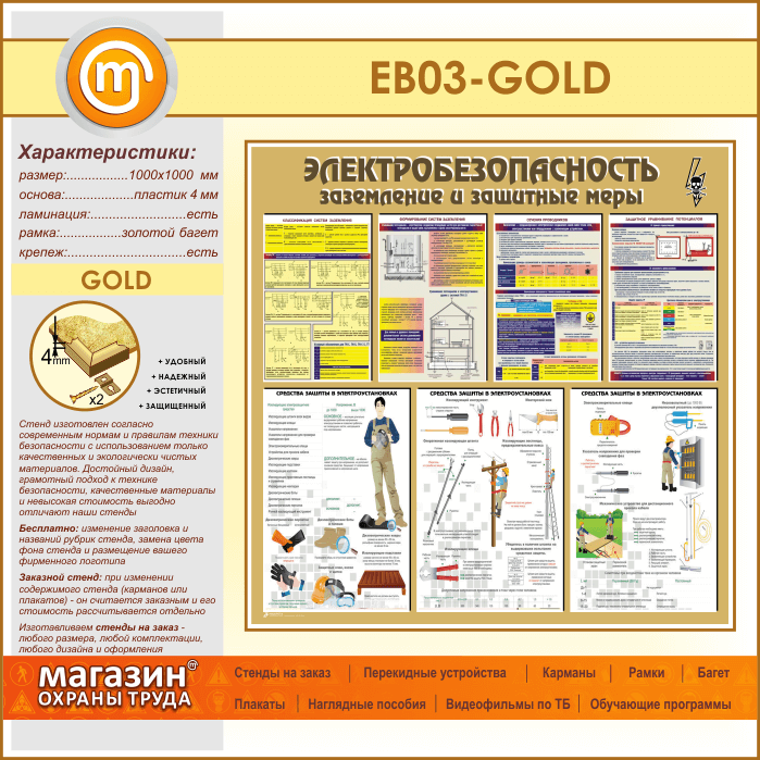 Стенд «Электробезопасность. Заземление и защитные меры» – это стенд с наглядной информацией о классификации систем заземления и формировании систем заземления, сечение проводников и защитное уравнивание потенциалов. Также на стенде размещена информация о средствах защиты в электроустановках – защитные очки и щитки, диэлектрические перчатки и обувь, изолирующие коврики и подставки, оперативные штанги и изолирующие клещи, знаки безопасности и переносные заземления