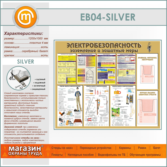 Стенд «Электробезопасность. Заземление и защитные меры» с 2 объемными карманами (EB-04-SILVER)