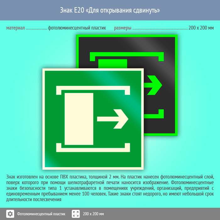 Знак E20 «Для открывания сдвинуть» на фотолюминесцентном пластике, размером 200х200 мм размещается на дверях помещений для обозначения действий по открыванию сдвижных дверей. Эвакуационные знаки безопасности изготовлены согласно ГОСТ Р 12.4.026-2015 и предназначены для обозначения направления движения и выходов при эвакуации