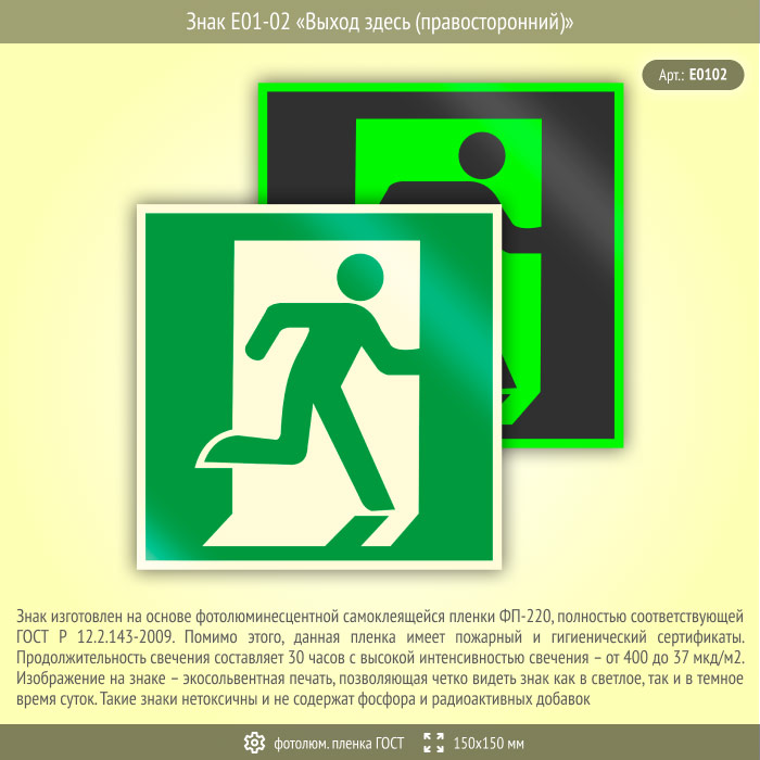 Знак E01-02 «Выход здесь (правосторонний)» на фотолюминесцентной пленке по ГОСТ 34428-2018, размером 150х150 мм обозначает место выхода – справа. Эвакуационные знаки безопасности изготовлены согласно ГОСТ Р 12.4.026-2015 и предназначены для обозначения направления движения и выходов при эвакуации