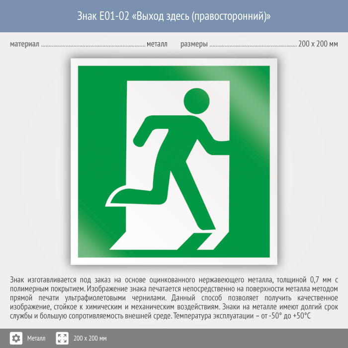 Знак E01-02 «Выход здесь (правосторонний)» на металле, размером 200х200 мм обозначает место выхода – справа. Эвакуационные знаки безопасности изготовлены согласно ГОСТ Р 12.4.026-2015 и предназначены для обозначения направления движения и выходов при эвакуации02
