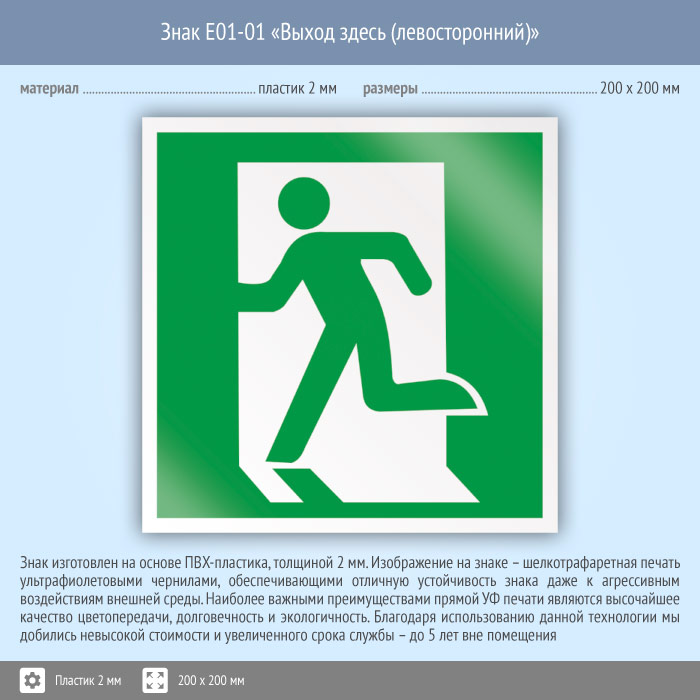 Знак E01-01 «Выход здесь (левосторонний)» на пластике, размером 200х200 мм обозначает место выхода – слева. Эвакуационные знаки безопасности изготовлены согласно ГОСТ Р 12.4.026-2015 и предназначены для обозначения направления движения и выходов при эвакуации