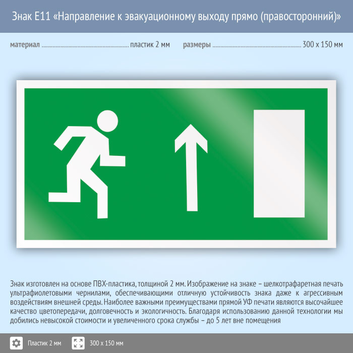 Знак E11 «Направление к эвакуационному выходу прямо (правосторонний)» (пластик, 300х150 мм)