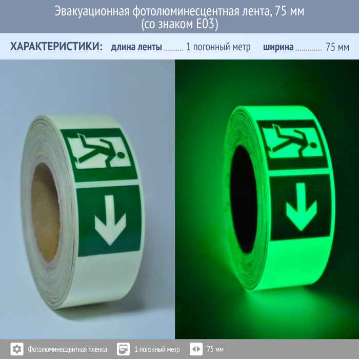 Представляет собой ленту из самоклеящейся фотолюминесцентной (светонакапливающей) плёнки шириной 75 мм с изображением периодически повторяющегося знака Е03 – направление к эвакуационному выходу направо. Применяется для дополнительного обозначения путей эвакуации