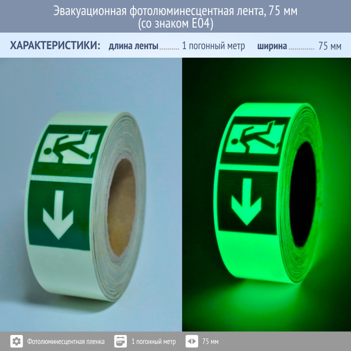 Представляет собой ленту из самоклеящейся фотолюминесцентной (светонакапливающей) плёнки шириной 75 мм с изображением периодически повторяющегося знака Е04 – направление к эвакуационному выходу налево. Применяется для дополнительного обозначения путей эвакуации