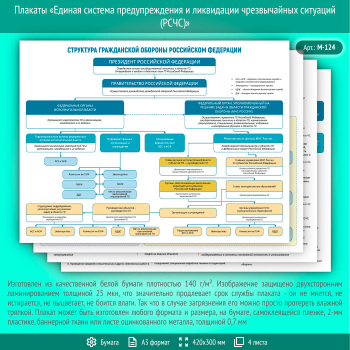 Плакаты «Единая система предупреждения и ликвидации чрезвычайных ситуаций (РСЧС)» (М-124, ламинированная бумага, А3, 4 листа)