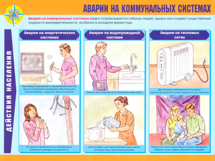 - Плакат «Аварии на коммунальных системах» – действия при аварии на энергетических системах, водопроводной системе и тепловых сетях