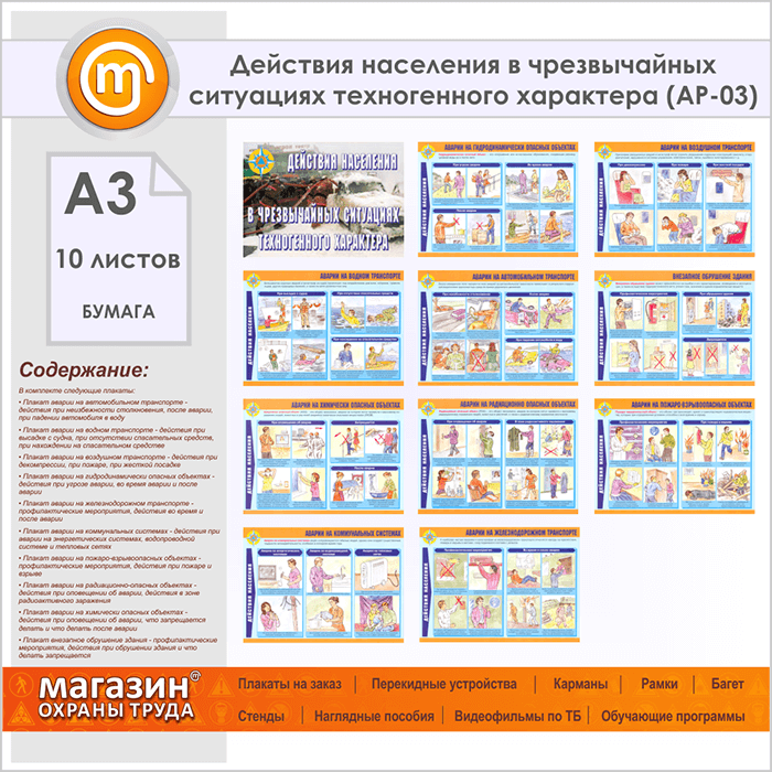 Плакаты «Действия населения в чрезвычайных ситуациях техногенного характера» (АР-03, бумага, А3, 10 листов)