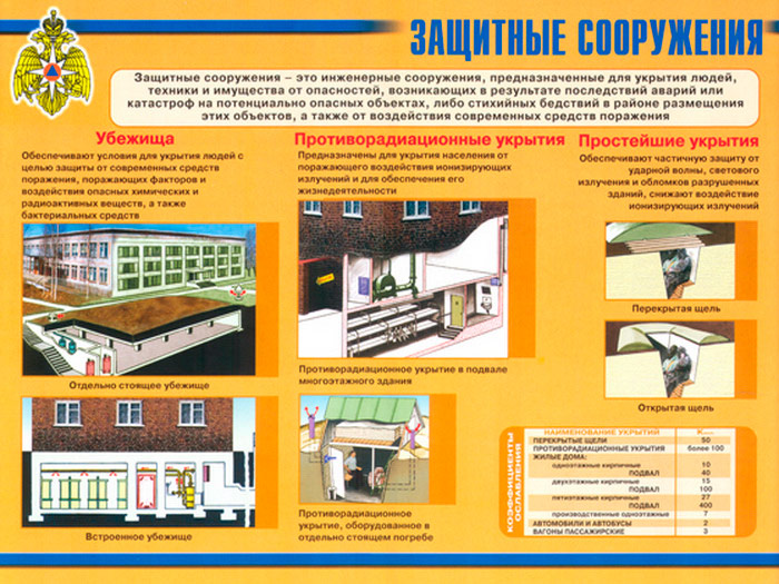 - Плакат «Защитные сооружения» – убежища, противорадиационные укрытия, простейшие укрытия