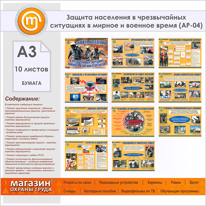Плакаты «Защита населения в чрезвычайных ситуациях в мирное и военное время» (АР-04, бумага, А3, 10 листов)
