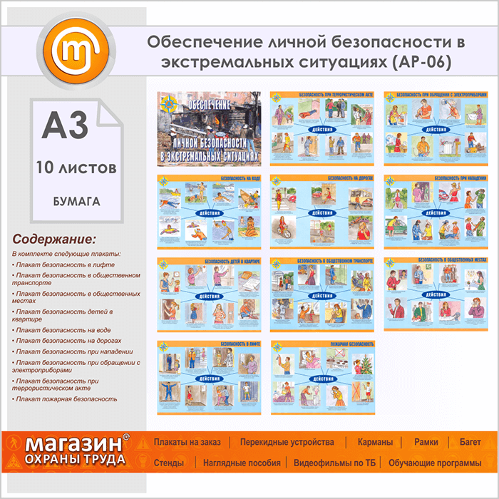 Плакаты «Обеспечение личной безопасности в экстремальных ситуациях» (АР-06, бумага, А3, 10 листов)
