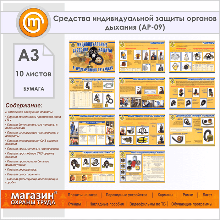 Плакаты «Средства индивидуальной защиты органов дыхания» (АР-09, бумага, А3, 10 листов)