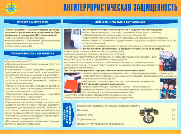 - Плакат «Антитеррористическая защищенность» – профилактические мероприятия, действия персонала и обучающихся, телефоны экстренного реагирования