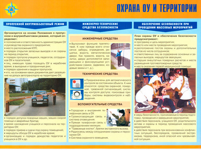 - Плакат «Охрана ОУ и территории» – пропускной внутриобъектовый режим, инженерно-технические средства безопасности, обеспечение безопасности при проведении массовых мероприятий