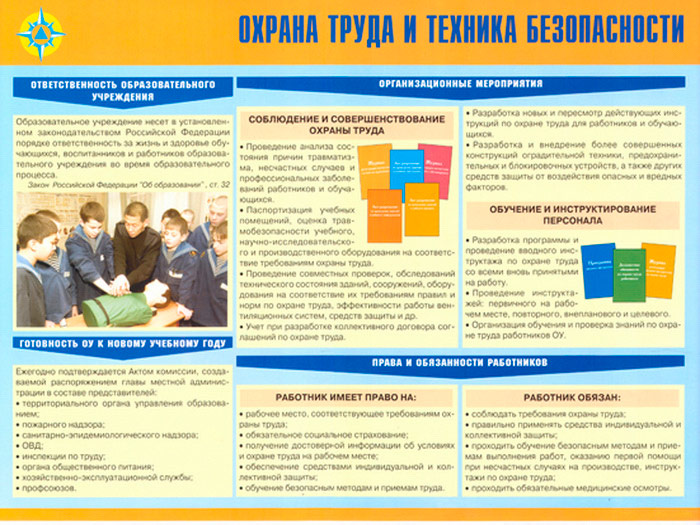 - Плакат «Охрана труда и техника безопасности» – ответственность образовательного учреждения, организационные мероприятия, готовность ОУ к новому учебному году, права и обязанности работников