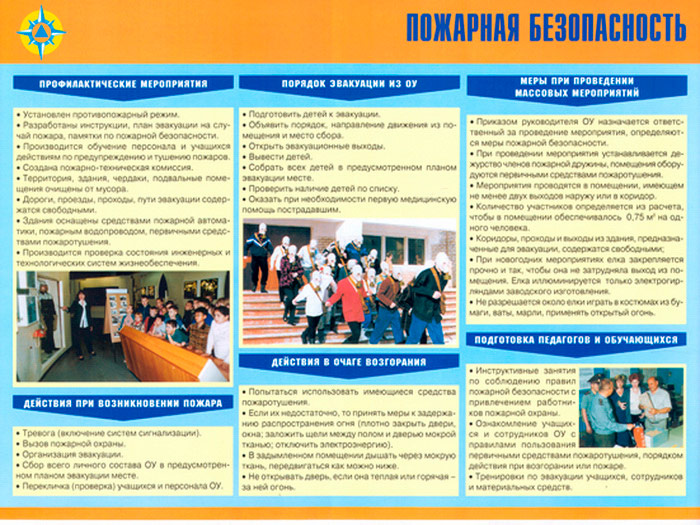 - Плакат «Пожарная безопасность» – профилактические мероприятия, порядок эвакуации из ОУ, меры при проведении массовых мероприятий, действия при возникновении пожара, действия в очаге возгорания, подготовка педагогов и обучающихся