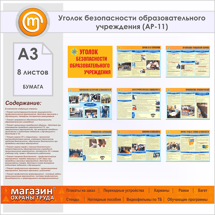 Плакаты «Уголок безопасности образовательного учреждения» (АР-11, бумага, А3, 8 листов)
