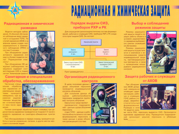 - Плакат «Радиационная и химическая защита» – порядок выдачи СИЗ и приборов, выбор и соблюдение средств защиты, санитарная обработка, организация радиационного контроля, защита рабочих и служащих от АХОВ