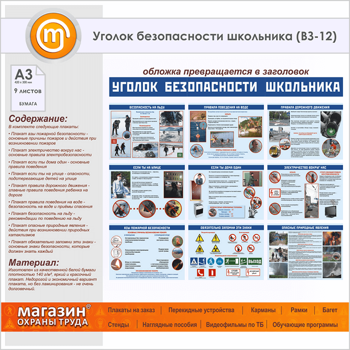 Комплект плакатов «Уголок безопасности школьника» из 9 листов – необходимое пособие для изучения ГО и ОБЖ в каждой организации