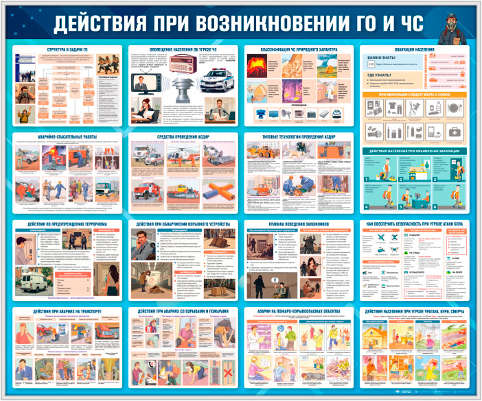 Стенд «Действия при возникновении ГО и ЧС» (GO-46)содержит наглядную информацию о действиях населения при угрозе и возникновении чрезвычайных ситуаций природного, техногенного и социального характера: порядок оповещения и эвакуации, поведение при авариях, взрывах, пожарах, террористической угрозе и применении оружия массового поражения. Представлены схемы гражданской обороны, типовые спасательные работы, правила при обнаружении взрывных устройств и подозрительных предметов, а также меры по обеспечению безопасности и оказанию первой помощи пострадавшим.