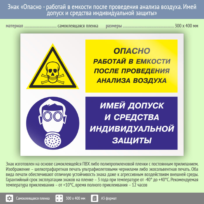 Знак «Опасно - работай в емкости после проведения анализа воздуха. Имей допуск и средства индивидуальной защиты», КЗ-39 на пленке, размером 400х300 мм напоминает о взятии проб качества воздуха перед работой и важности санкционированного доступа и использования СИЗ. Комбинированные знаки безопасности состоят из основных и дополнительных знаков с поясняющими надписями и предназначены для изложения комплексных требований, направленных на обеспечение безопасности
